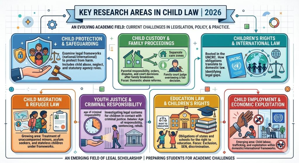 Child law is a rich and evolving academic field. Before selecting a dissertation topic, it helps to understand the main research areas where scholars are currently producing meaningful work. These areas are grounded in established legal scholarship and reflect current challenges in legislation, policy, and practice.