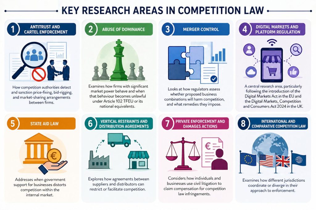 Before selecting a topic, it helps to understand the established subfields within competition law. Each of these areas generates active scholarship and offers opportunities for original research.