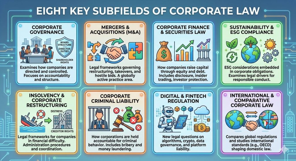 Before selecting a topic, it helps to understand the main subfields within corporate law where meaningful dissertation research takes place. These areas are grounded in established academic and legal practice, not invented trends.