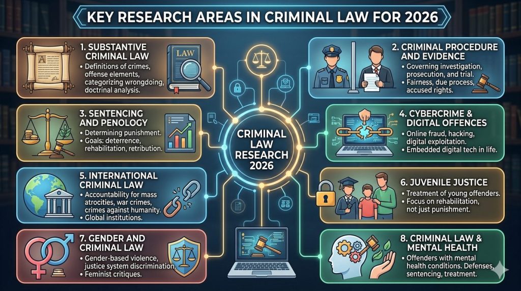 Before selecting a dissertation topic, it helps to understand the major research domains within criminal law. These areas reflect both established academic traditions and the directions in which contemporary scholarship is moving.