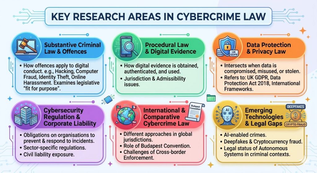 Before selecting a specific topic, it helps to understand the established academic domains within cybercrime law. These areas reflect the major debates in legal scholarship, policy development, and comparative jurisprudence.