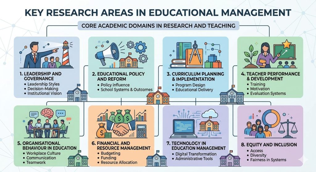 Educational management is broad, but it can be broken into core academic domains. These areas are widely recognised in research and teaching.