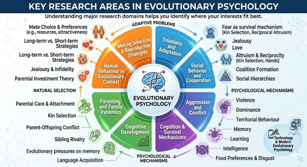 Evolutionary psychology focuses on how human behaviour, cognition, and emotions have been shaped by natural selection. This makes it a rich and interdisciplinary field, combining biology, psychology, anthropology, and even sociology.