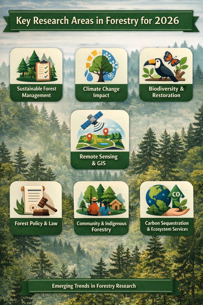 Forestry research in 2026 is shaped by sustainability, digital transformation, and ecological resilience. Below are the major academic domains: