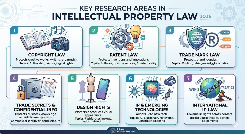 Before exploring individual topics, it helps to understand the main research areas within IP law. These are well-established academic domains that continue to generate active scholarly debate.