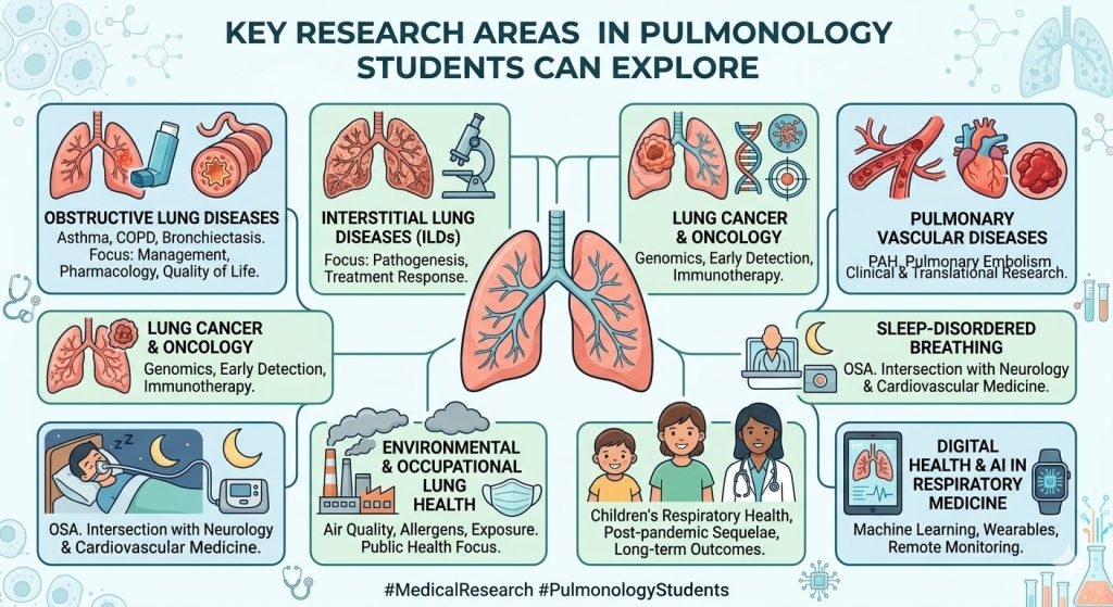 Before selecting a specific topic, it helps to understand the main subfields that make up modern pulmonology research. Each of the areas below represents a domain with active scholarly output, peer-reviewed journals, and ongoing clinical studies.