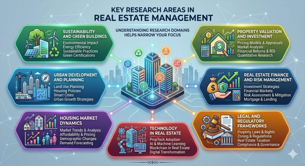 Understanding research domains helps you narrow your focus. Real estate management is broad, but most topics fall into structured areas.