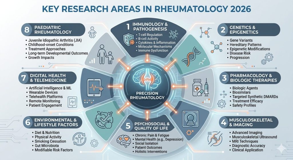 Rheumatology is a broad discipline, and understanding its major research domains helps you identify where your dissertation could sit. The following areas represent well-established academic directions and emerging frontiers that are shaping rheumatology research in 2026.